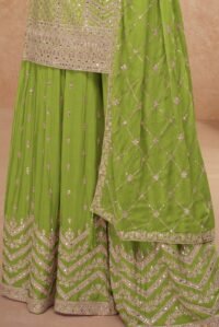 • Fabric Details :-Top :- Heavy Chinon With Sequence Embroidery Stitch Work || Inner :- Heavy Santoon Silk (Attach) || Bottom (Plazo) :- Heavy Chinon With Sequence Embroidery Stitch Work  With Inner Attached Santoon Silk || Dupatta :- Heavy Chinon With Sequence Embroidery Stitch Work 4 Side Lace Work & Latkan ||