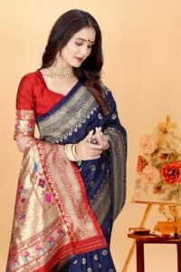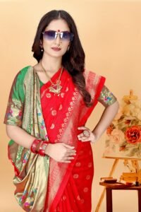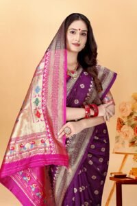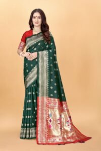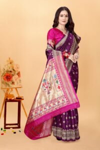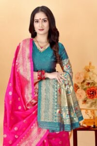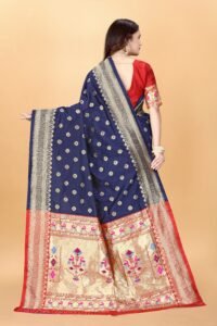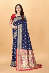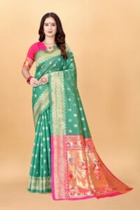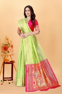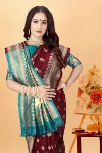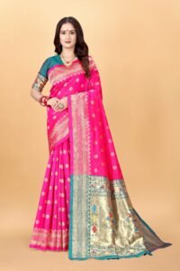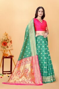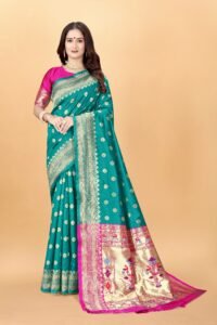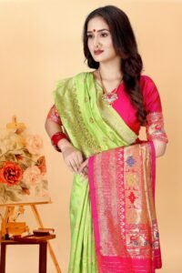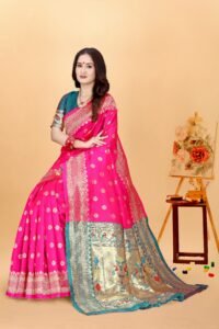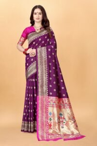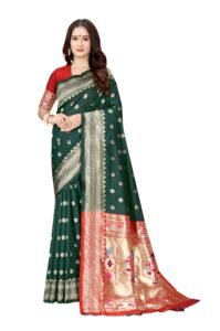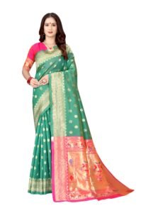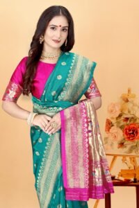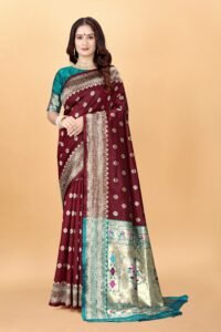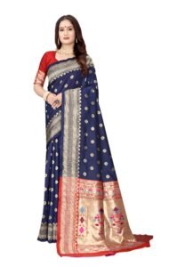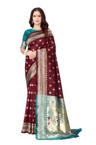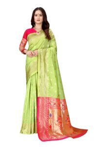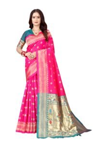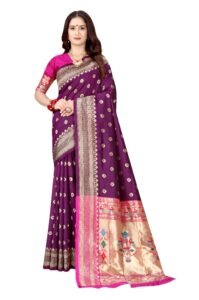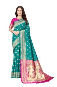 This Beautiful Indian Traditional Ethnic Kanjivaram Banarasi Art Silk Saree . Saree is India’s one of the most popular and widely used traditional attires. The beauty and elegance of Indian women can be best revealed in sareeSaree, also called as Sari, is the most famous Indian attire worn by women not only in India but all over the world.