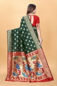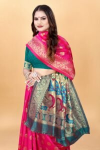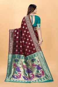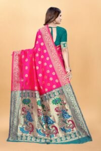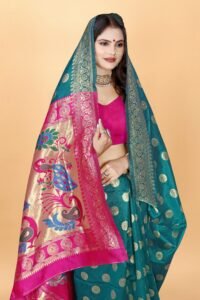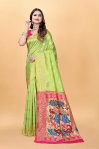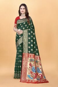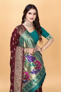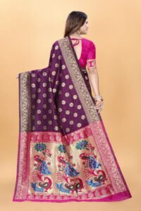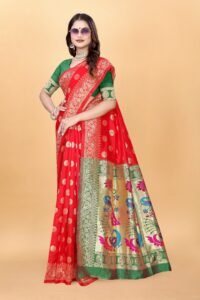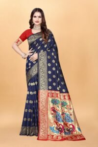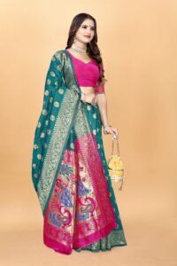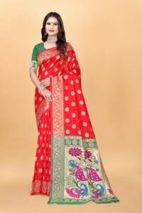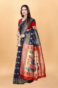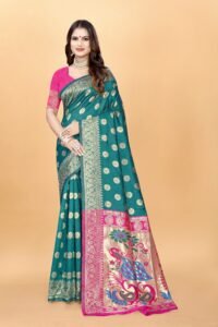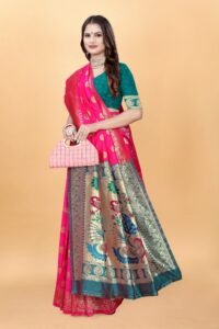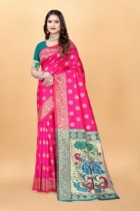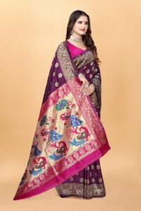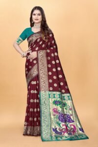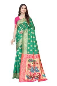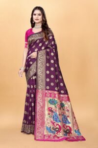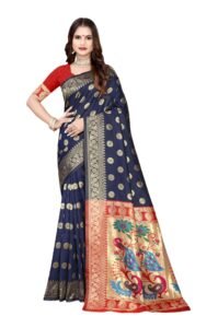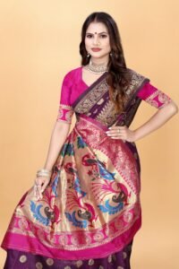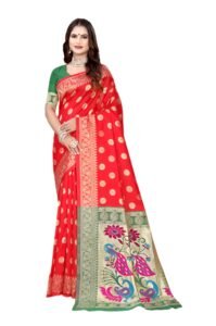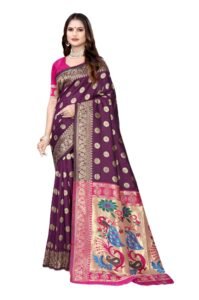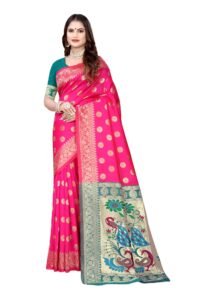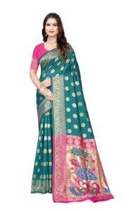This Beautiful Indian Traditional Ethnic Kanjivaram Banarasi Art Silk Saree . Saree is India’s one of the most popular and widely used traditional attires. The beauty and elegance of Indian women can be best revealed in sareeSaree, also called as Sari, is the most famous Indian attire worn by women not only in India but all over the world.